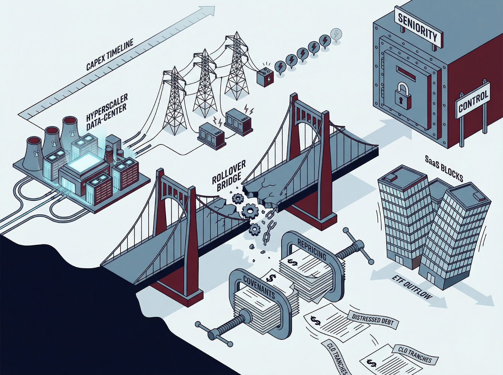 Software loan repricing, hyperscaler capex acceleration, grid reliability constraints, and opportunistic credit rotation are tightening clearance before defaults appear.