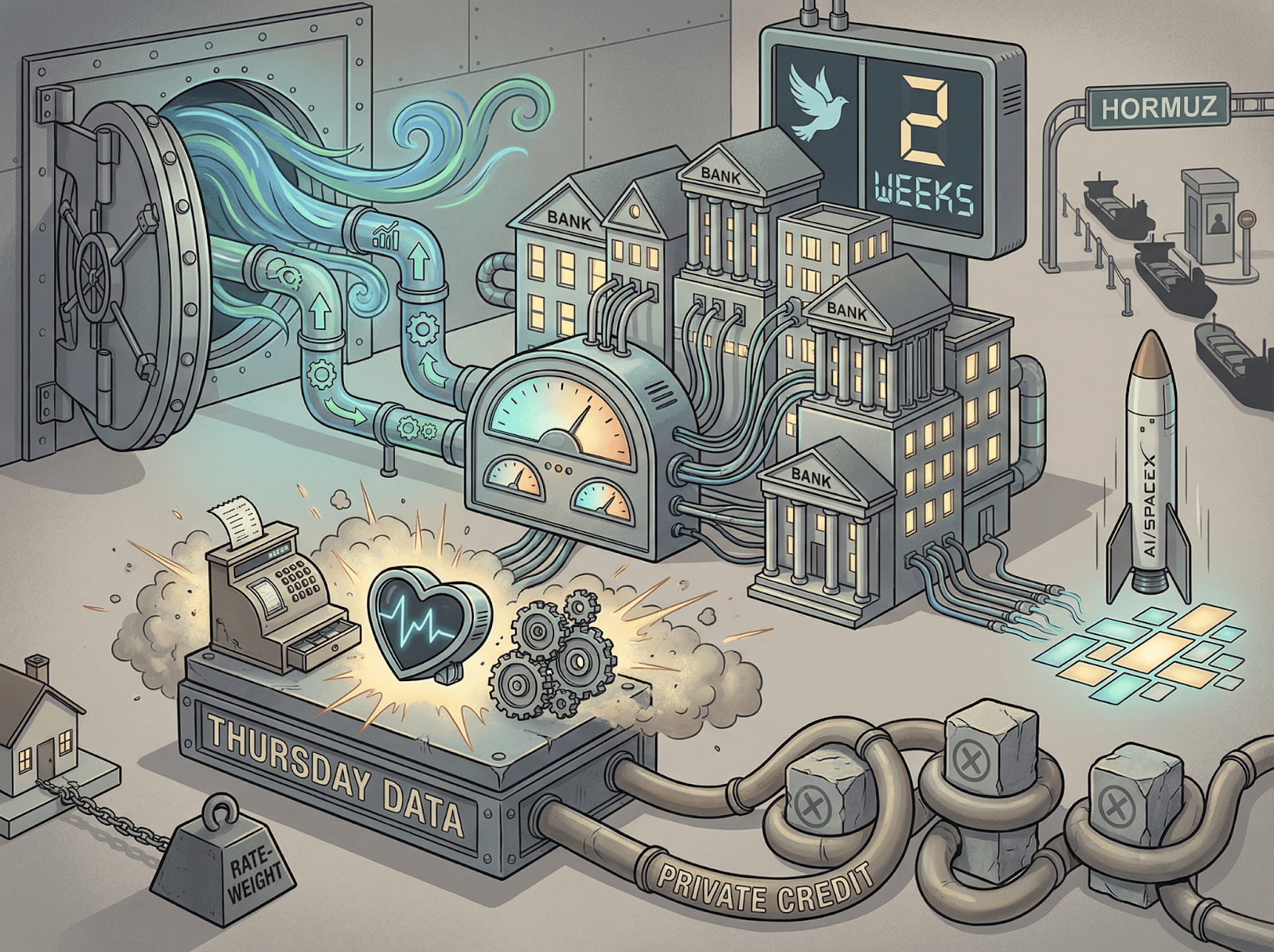 Every one of those data points feeds back into the six stories from last week. Bank credit quality tests the private credit divide. Retail sales test whether the energy shock has reached the consumer. Housing tests whether rate expectations have killed demand. The ceasefire tests whether oil reprices higher before any of it adjusts.